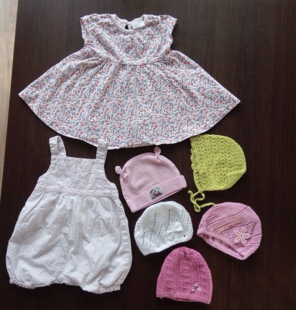 10) Čepičky – 5x – bavlněná s oušky, 3x Jerry collection – bílá s mašličkou, světle růžová s velkou kytkou a tmavě růžová s malými kytičkami, háčkovaná světle zelinkavá na zavazování